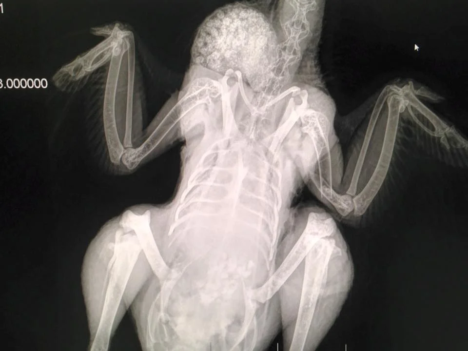 X-ray of a chicken with a broken wing. The chicken required sutures and a splint and recovered wonderfully.